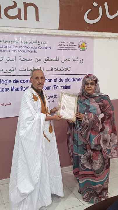 L’atelier a été aussi l’occasion de distinguer Mme Saviya mint Bamba, directrice de l’enseignement fondamental, au nom de l’antenne régionale de COMEDUC de la wilaya de Dakhlet Nouadhibou dans laquelle Mme la directrice avait auparavant servi comme directrice régionale de l’éducation nationale. Un certificat d’honneur lui a été remis par M. Saleck Maham, président du Conseil d’administration de COMEDUC, sous les applaudissements des participants à l’atelier.