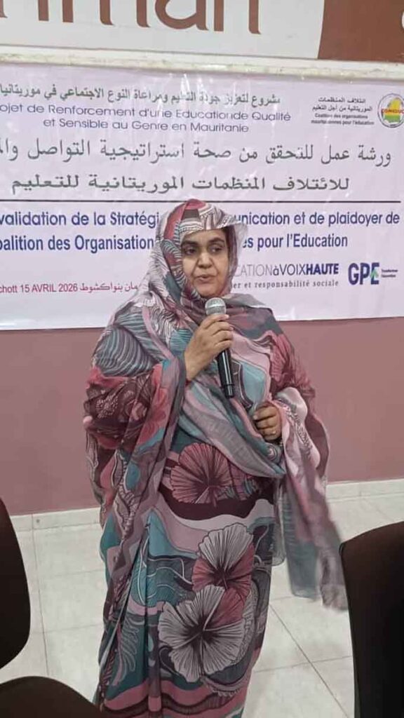 Mercredi, 15 avril 2026, la Coalition a organisé un atelier à l’hôtel Al Imane de Nouakchott, pour valider sa stratégie de communication et de plaidoyer. La stratégie a été élaborée et présentée par l’expert M. Mohamed Elmoctar Sidina en présence des membres du CA de la Coalition, d’un grand nombre de président(e)s et représentant(e)s d’organisations de la société civile, membres de la Coalition. Etaient également présents des représentants du ministère de l’éducation et de la réforme du système éducatif, en plus du président de la commission parlementaire chargée de l’éducation à l’assemblée nationale et des représentants de l’Unicef et de World Vision.